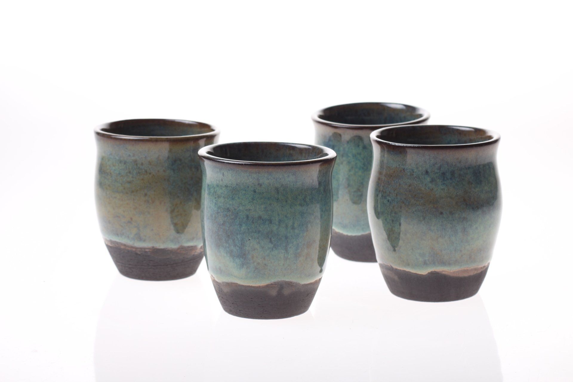 Olieflesje, beker met tapasschaaltje allemaal nigra 2002 zwarte klei met amaco storm en seaweed glazuur. I love it.Button